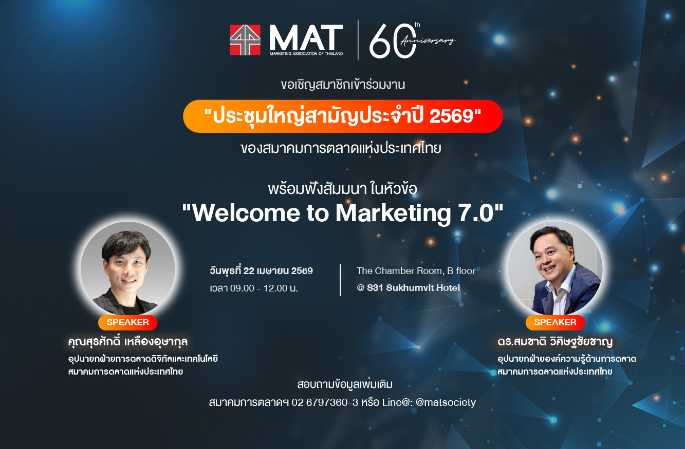 สมาคมการตลาดแห่งประเทศไทย (Marketing Association of Thailand: MAT) ซึ่งเป็นสมาชิกของเครือข่าย สหพันธ์การตลาดแห่งเอเชีย (Asia Marketing Federation) ที่มีสมาชิกสมาคมการตลาดครอบคลุม 17 ประเทศและเขตเศรษฐกิจทั่วเอเชีย เผยแพร่ “10 เทรนด์การตลาดประเทศไทย ปี 2569” สะท้อนบทบาทสำคัญต่อการกำหนดทิศทางการตลาดในระดับภูมิภาคเอเชีย