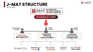 J-MAT มีการแบ่งหน้าที่การบริหารอย่างชัดเจนเพื่อกำหนดหน้าที่และความรับผิดชอบของแต่ละบุคคลในระยะเวลา 1 ปี