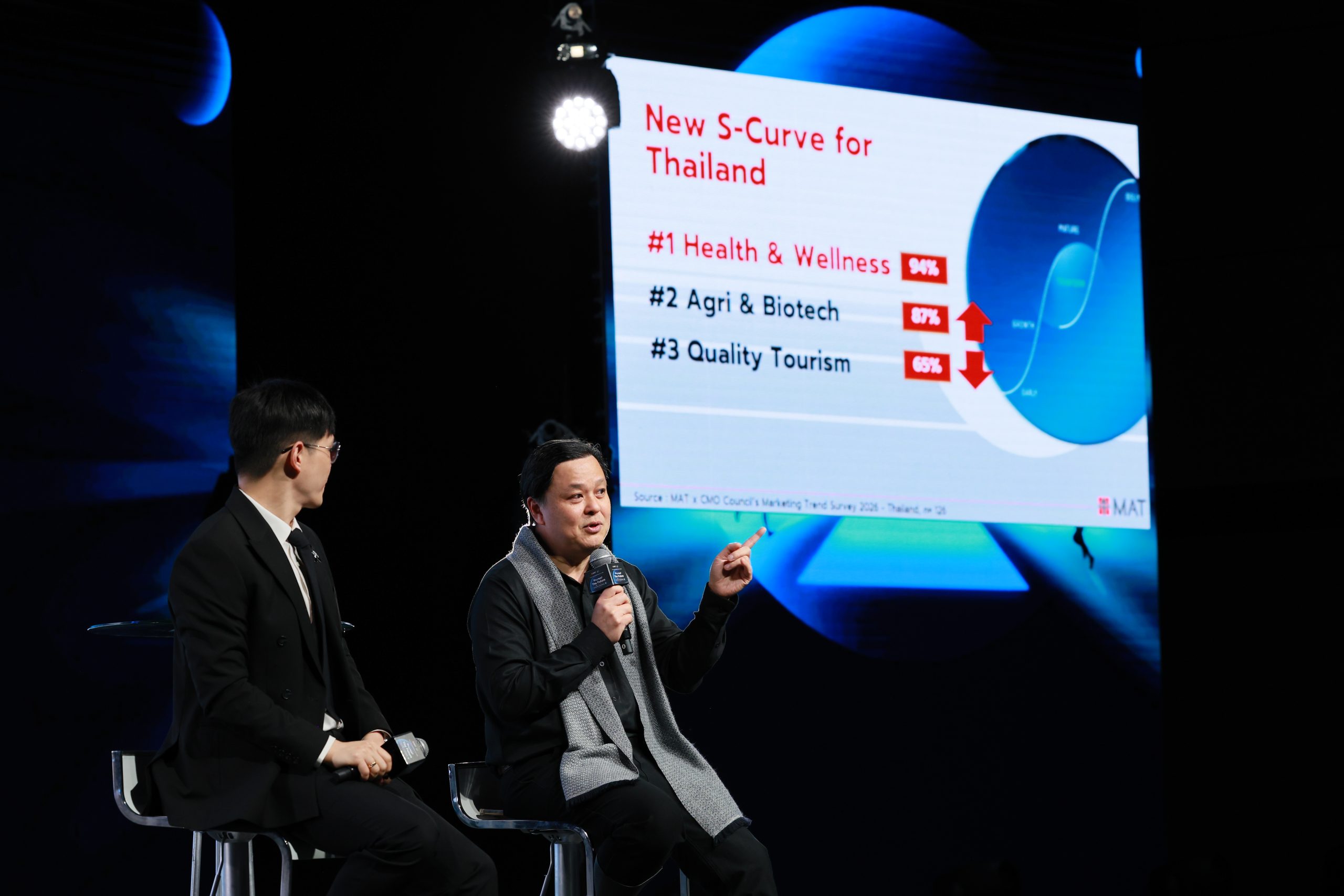 ในเวทีเสวนา “วันนักการตลาดแห่งประเทศไทย 2568 (Thailand Marketing Day 2025) หัวข้อ ฟันธงเทรนด์การตลาด Marketing Trends : 2026 Way to Forward ดร.สมชาติ วิศิษฐชัยชาญ อุปนายกฝ่ายองค์ความรู้ด้านการตลาด สมาคมการตลาดแห่งประเทศไทย และผศ.ดร.เอกก์ ภทรธนกุล อุปนายกฝ่ายกิจกรรม การสื่อสาร และการตลาดยั่งยืน สมาคมการตลาดแห่งประเทศไทย ร่วมกันเปิดผลสำรวจ Marketing Trends 2026: Way Forward สำรวจจากนักธุรกิจการตลาดชั้นนำ 126 ราย ที่มีรายได้ 300,000 บาทต่อเดือนขึ้นไป และคุมทัพพนักงาน 5,000 คนขึ้นไป โดยมองว่า เศรษฐกิจในปี 2026 ยังเต็มไปด้วยความท้าทาย อาทิ ภาวะเศรษฐกิจชะลอตัว และปัญหาทางการเมือง ทำให้ประเมินว่า เศรษฐกิจปี 2026 น่าจะเติบโตราว 0.9%